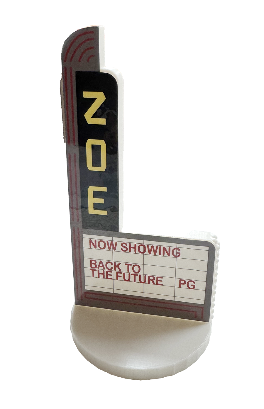 Capture a piece of the past with a 3D-printed Zoe Theater Marquee. Customize the marquee with a favorite movie, name, or saying! The marquee has a free-standing base, or with the attached magnets can hang on your refrigerator! Be sure to include the movie or verbiage you want included on the marquee. The magnet is 6″ tall, 3″ wide, and 1-13/16″ deep.